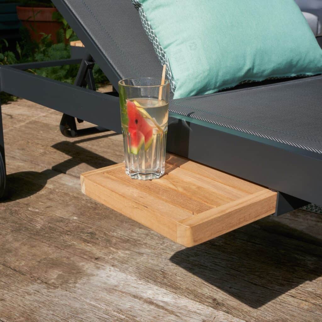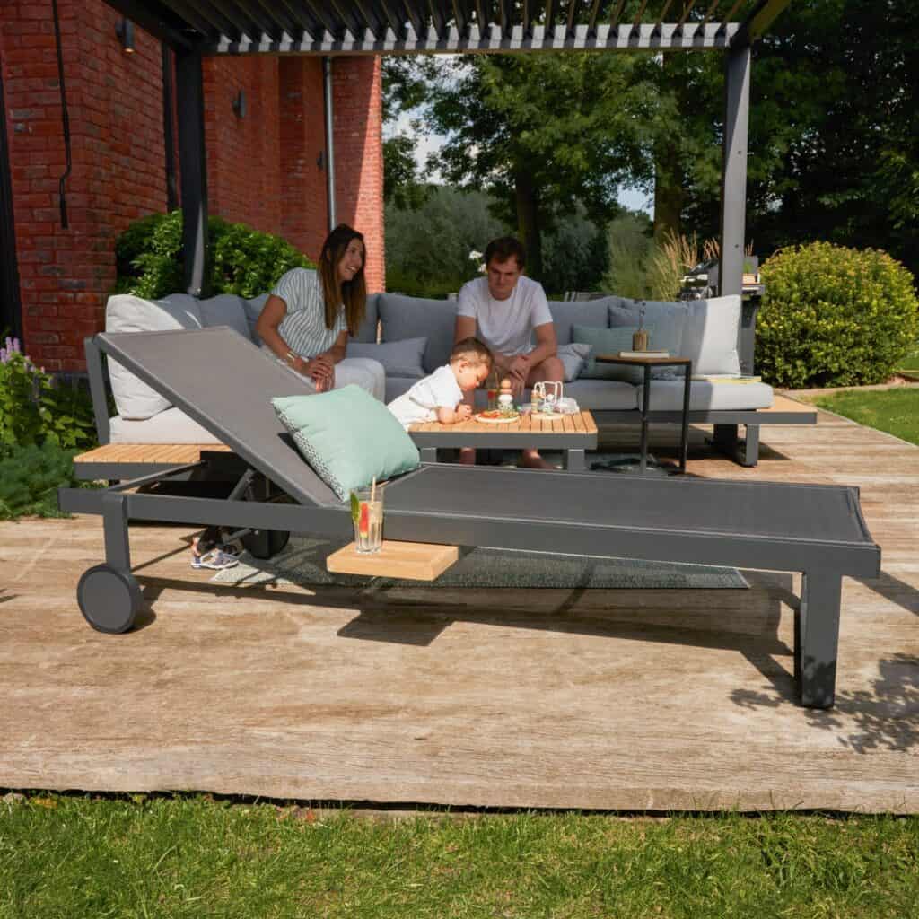 La asoleadora Persea ofrece una posición cómoda para relajarse al aire libre. Sus ruedas facilitan el movimiento según la luz y el momento del día.
