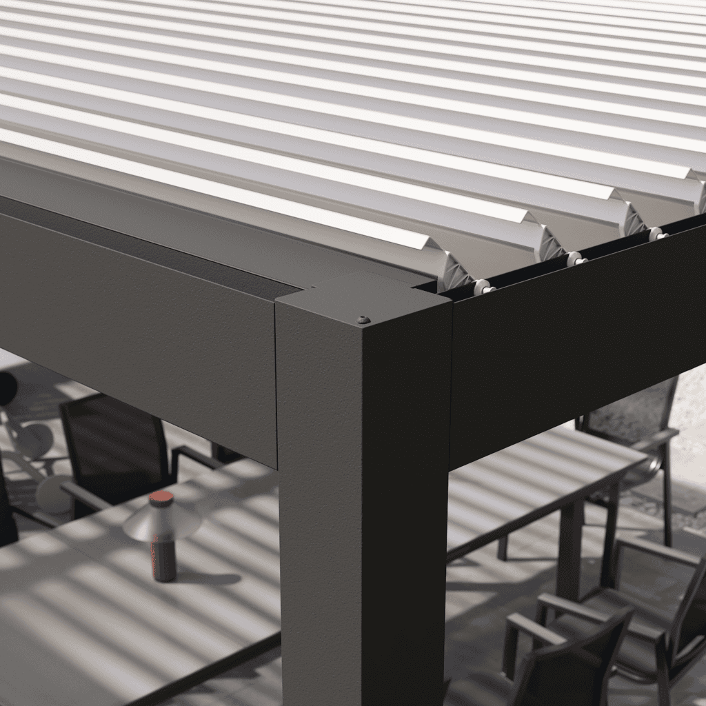 Fabricada en aluminio con lamas y acabado gris oscuro, mantiene el mismo diseño bioclimático: ventilación, luz modulable y un look contemporáneo que combina con terrazas modernas o jardines.
