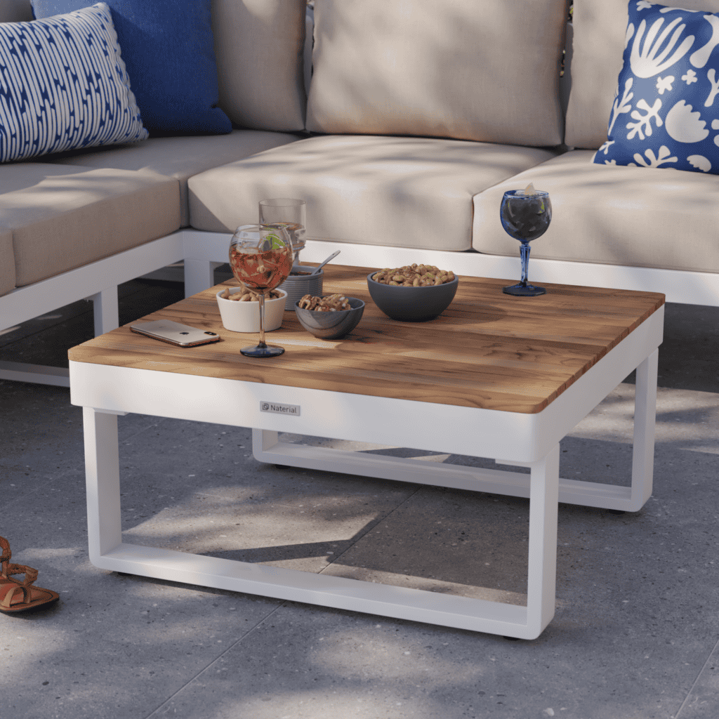 Esta mesa acompaña perfectamente salas de exterior, ofreciendo una superficie práctica para el uso diario en terraza o patio.