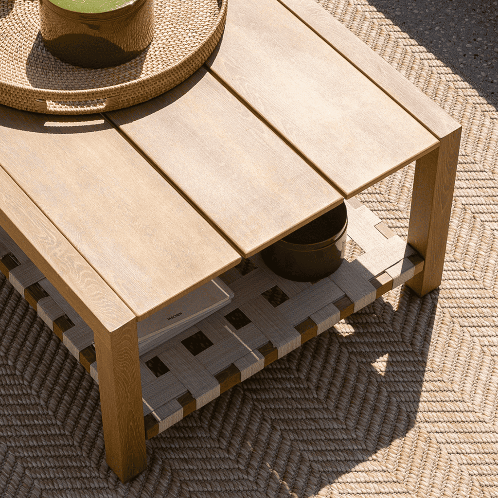 Una mesa de centro amplia que organiza el lounge y acompaña el día a día en terraza o jardín.