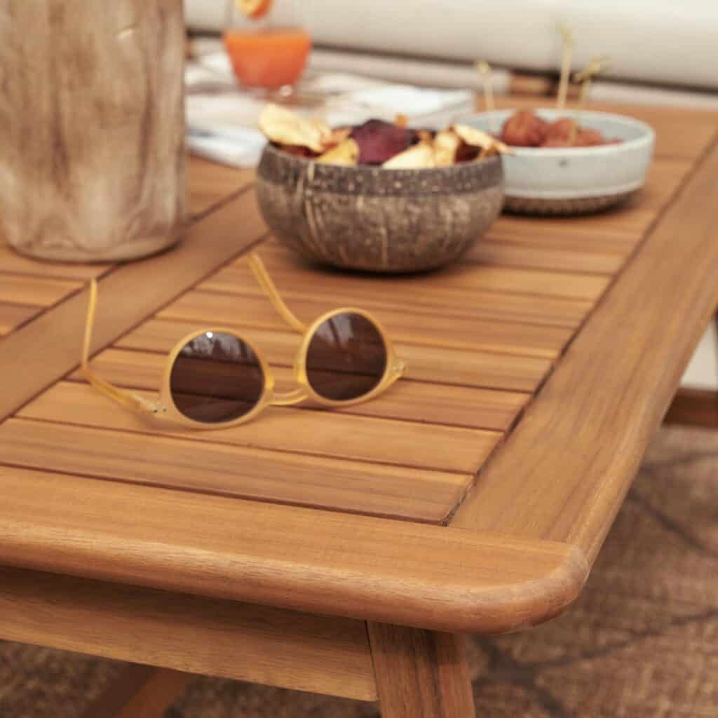 Perfecta para compartir aperitivos y momentos de descanso, esta mesa aporta calidez y funcionalidad al exterior.