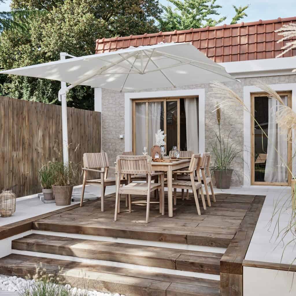 Gracias a su extensión tipo mariposa, esta mesa permite recibir cómodamente a familia y amigos en terraza o jardín.