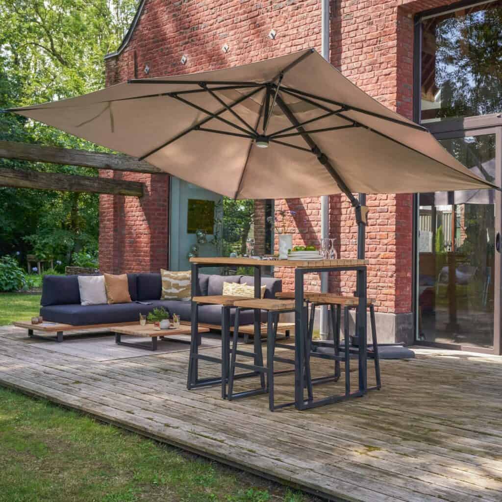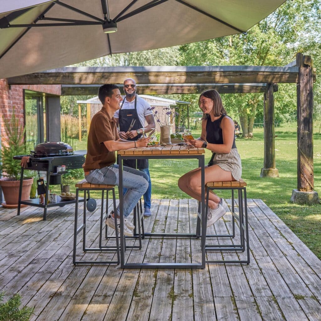 Funciona bien en terrazas familiares y jardines.