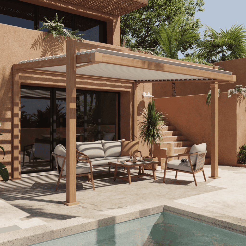 Diseño inclinado y carácter: una pérgola que acompaña sol y lluvia mientras viste la terraza con calidez.