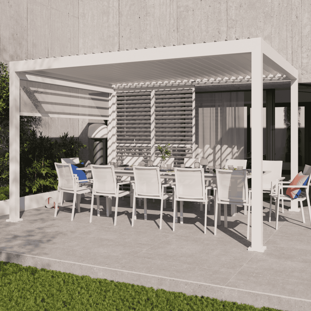 Estructura y lamas en aluminio con acabado blanco: diseño limpio, resistente y fácil de combinar. Ideal para rooftop, terraza o patio donde quieres un look moderno y ordenado.