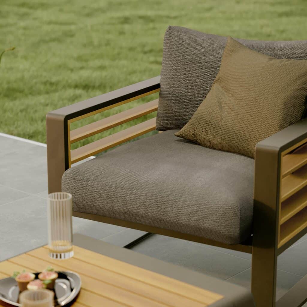 Naterial combina aluminio y teca FSC en la serie IONIS para un resultado moderno y resistente.