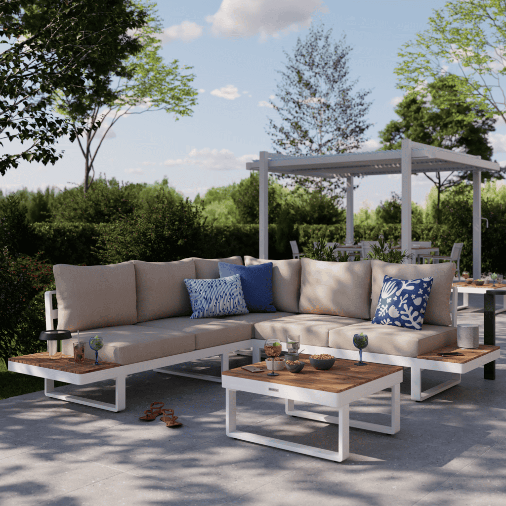 Este salón esquinero Persea crea un espacio acogedor para disfrutar del exterior en familia o con amigos. Su formato generoso se adapta perfectamente a terrazas, patios y zonas sociales.