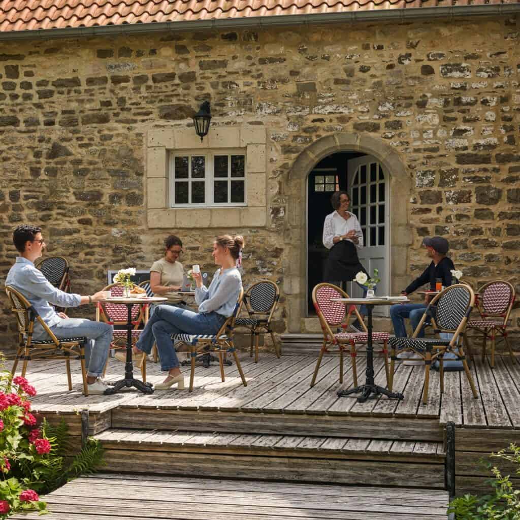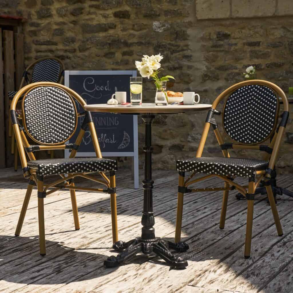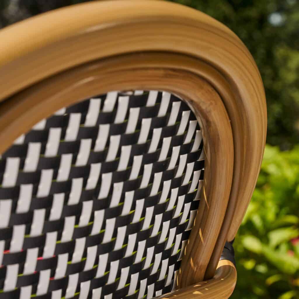 Esta silla Paris aporta ligereza visual y comodidad para comedores exteriores modernos.