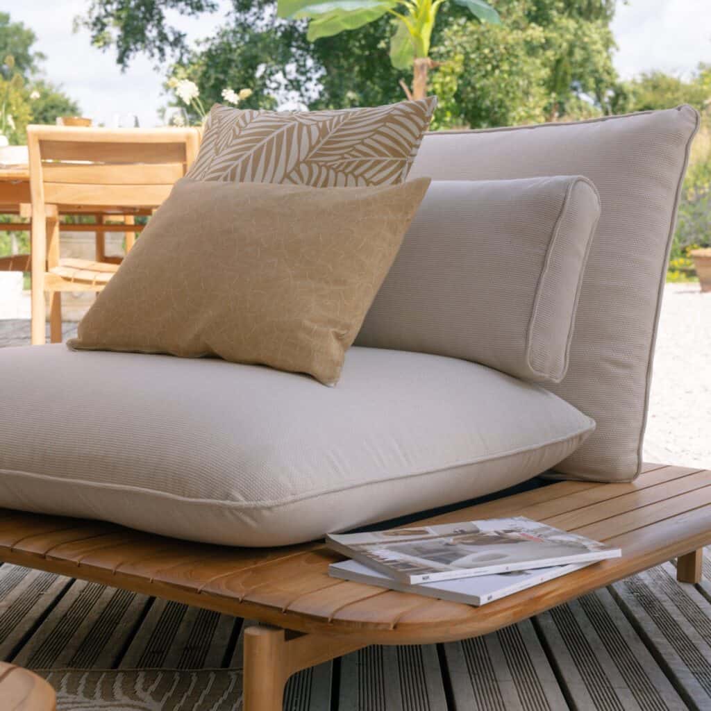 El sillón Aurora crea un rincón de descanso elegante para disfrutar del exterior con calma y confort.
