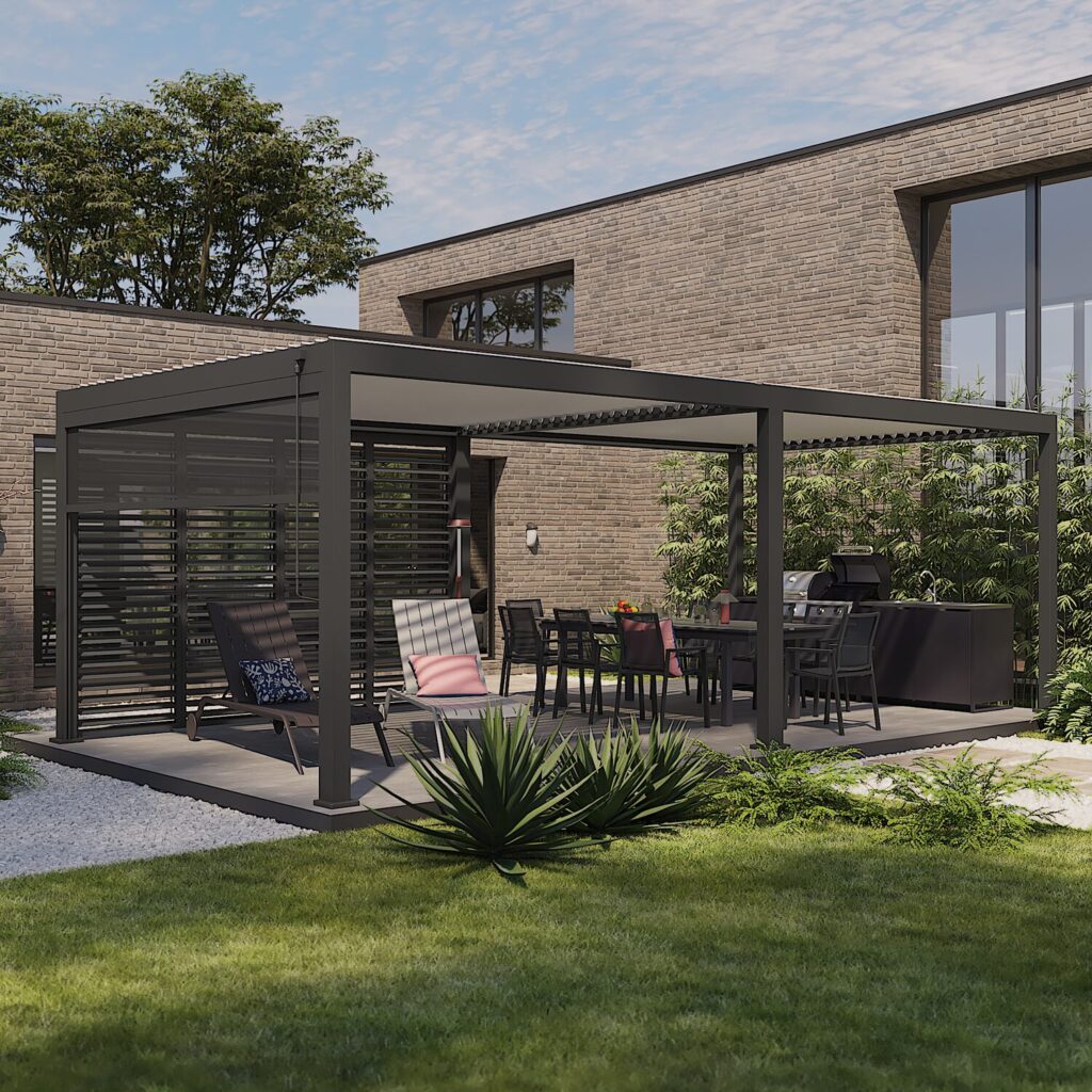 Escalable y personalizable, la pérgola Clima Astra se adapta a cualquier configuración. Esta extensión específica se acopla a tu pérgola principal, duplicando eficazmente la superficie cubierta. Disponible en antracita y blanco, esta extensión de aluminio es inoxidable y resistente a los rayos UV y a las inclemencias del tiempo, garantizando una protección duradera para su espacio exterior. Sus lamas de doble pared ofrecen una resistencia superior al invierno. La extensión también admite persianas de textileno y paneles de lamas de aluminio ajustables en todos los lados, lo que proporciona protección contra el sol bajo y las miradas indiscretas. Construida con una estructura y lamas íntegramente de aluminio, incluyendo un 50% de aluminio reciclado, esta pérgola garantiza calidad y durabilidad.