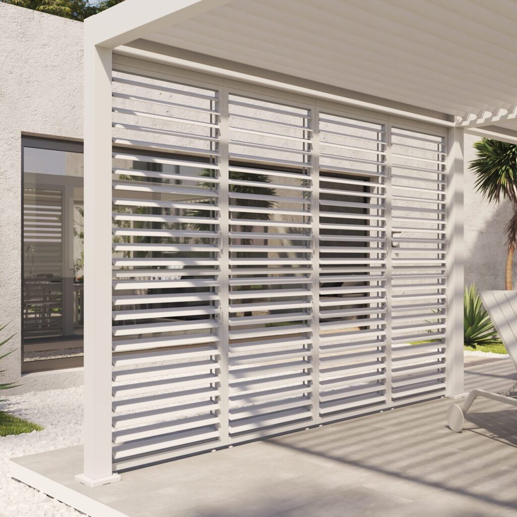 El panel de lamas ajustable Astra se integra perfectamente con tu pérgola gracias a su diseño limpio y su color blanco. Así, podrás crear un ambiente cálido e íntimo bajo tu pérgola. Modular, se puede fijar individualmente a la estructura o en múltiples para crear una sección de pared completa. Este modelo está diseñado para fijarse a la pérgola Clima Astra de 3,6 x 3,6 m o a su extensión. Hay otros modelos disponibles para complementar las pérgolas Clima en diferentes tamaños y colores.