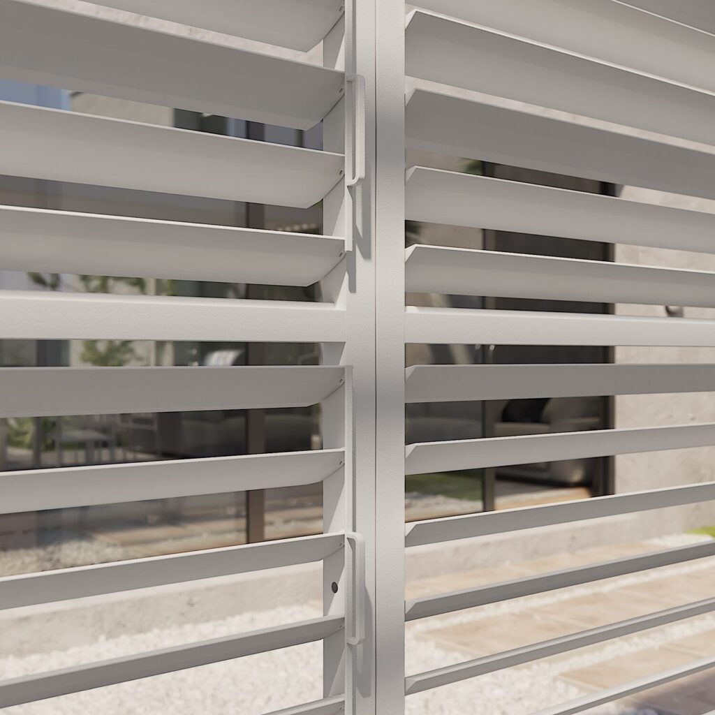 Crea un espacio privado y personalizado con el panel de lamas ajustable Astra. Este panel te protege del sol y de las miradas indiscretas, a la vez que añade un toque estético a tu pérgola. Disfruta al máximo de tu patio con total privacidad. Sus lamas se ajustan mediante dos manivelas independientes, lo que te permite orientar las secciones superior e inferior del panel, modulando así la luz y la ventilación a tu gusto.
