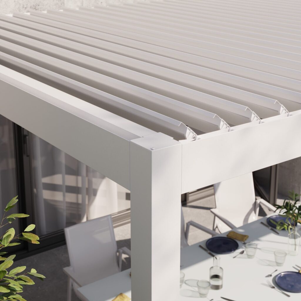 Vive en completa armonía con tu entorno bajo la pérgola bioclimática adosada Clima Astra. Gracias a sus lamas ajustables (de 0 a 120°), tendrás un control perfecto de la luz durante todo el día y ventilación natural bajo esta pérgola adaptable. En verano, ajusta las lamas con la manivela para crear sombra: el color claro de las lamas ha sido especialmente seleccionado para reflejar la luz solar y evitar la acumulación de calor. Al inclinarlas, crean una suave y refrescante brisa que permite la salida del aire caliente. En invierno, abre las lamas para dejar entrar la luz y calentar tu interior. Al cerrarlas, las lamas dirigen el agua a un sistema de drenaje integrado en las patas de la estructura.