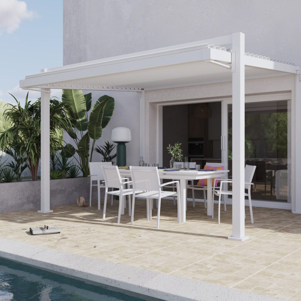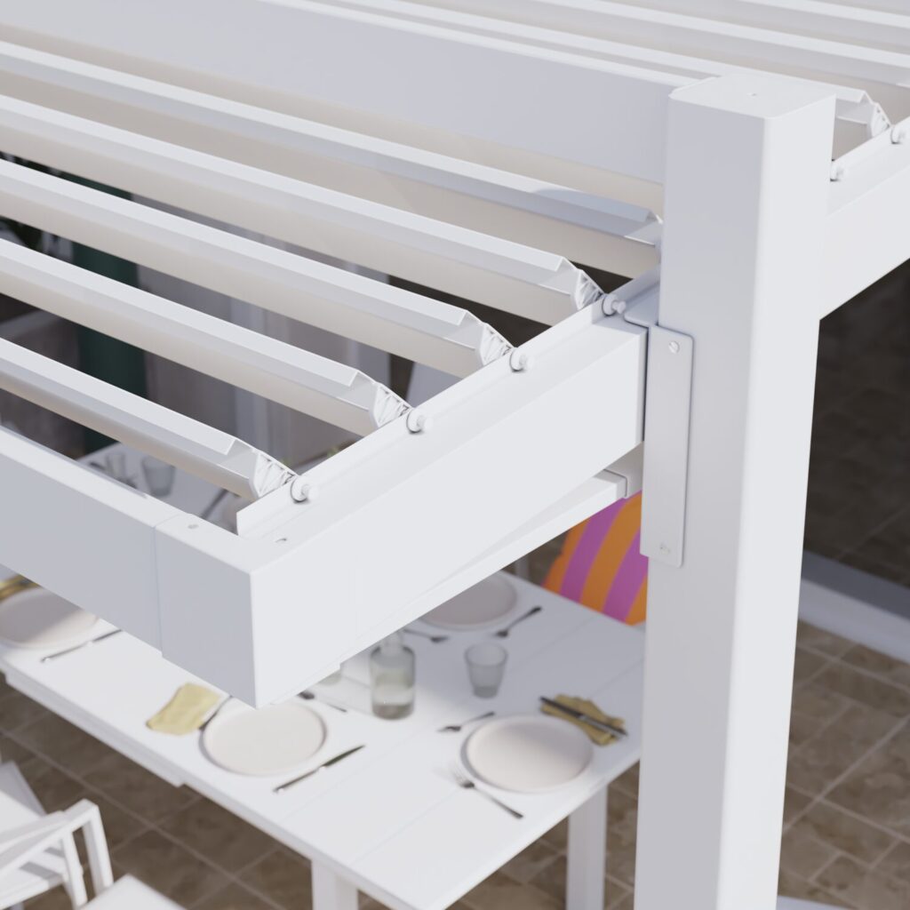 Vive en completa armonía con tu entorno bajo la pérgola bioclimática angular Clima Odyssea. Gracias a sus lamas ajustables (de 0 a 90°), tendrás un control perfecto de la luz y la ventilación natural bajo esta pérgola adaptable. En verano, ajusta las lamas con la manivela para crear sombra: su color claro ha sido especialmente seleccionado para reflejar la luz solar y evitar la acumulación de calor. Al inclinarlas, crean una suave y refrescante brisa que permite la salida del aire caliente. En invierno, abre las lamas para dejar entrar la luz y calentar tu interior. Al cerrarlas, las lamas dirigen el agua a un sistema de drenaje integrado en las patas de la estructura.