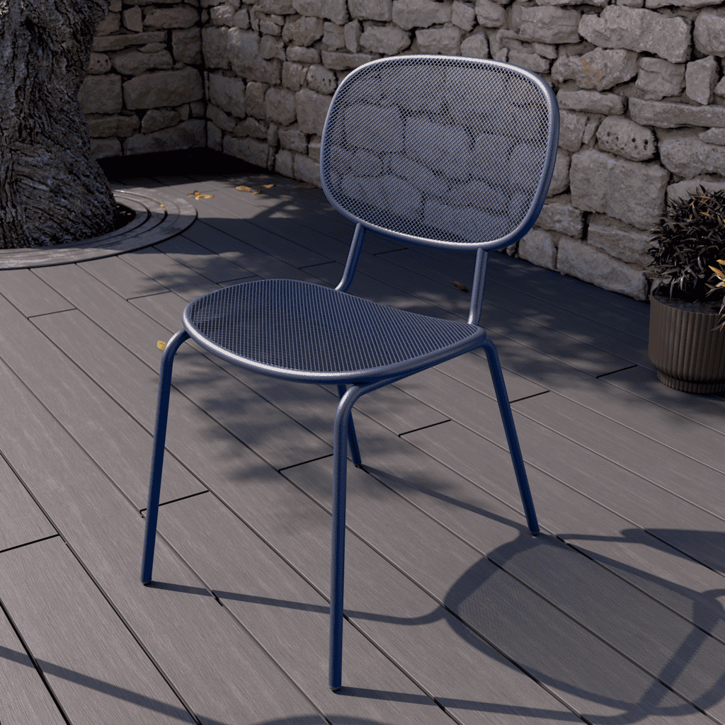 Avec son design épuré et sa couleur bleu, la gamme Ikaros apportera un style industriel tendance à votre extérieur. Son assise en acier perforé apportera un style contemporain unique à votre terrasse. Coordonnez-la avec les tables de jardin et le salon bas de la gamme Ikaros pour créer un espace harmonieux.