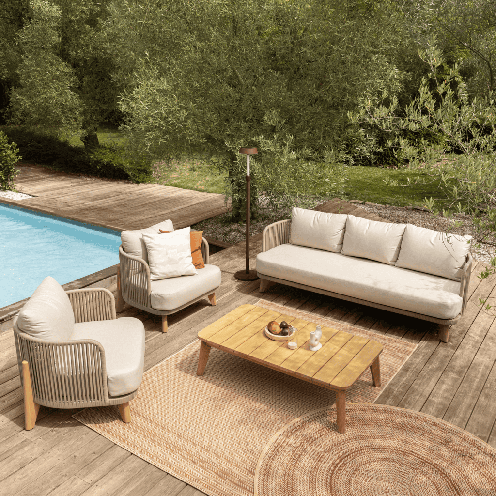 La gamme Livas se distingue par son mélange de matériaux naturels et modernes. Le teck FSC apporte une touche chaleureuse et authentique, tandis que la cordes synthétique et l’aluminium lui confèrent un style contemporain. Pour créer un salon de jardin harmonieux, associez ce fauteuil au canapé extérieur et à la table basse Livas. Un ensemble durable et contemporain pour créer une ambiance naturelle et conviviale en extérieur.