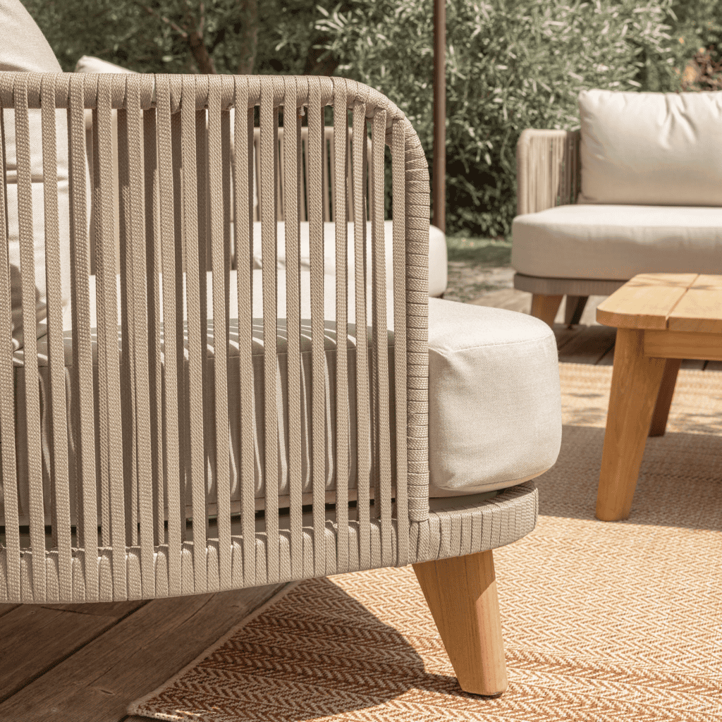 Profitez d’une pause café sur votre terrasse avec le fauteil extérieur Livas. Conçu pour s’intégrer harmonieusement à votre espace extérieur, ce fauteuil combine la chaleur du teck FSC, la robustesse de l’aluminium et le confort d’une assise généreuse. Pratique au quotidien, sa structure en aluminium et son assise en corde synthétique lui confèrent confort et grande résistance aux intempéries. Ses coussins en acrylique sont imperméables et déhoussables, et sont fixés à la structure pour éviter la prise au vent.
