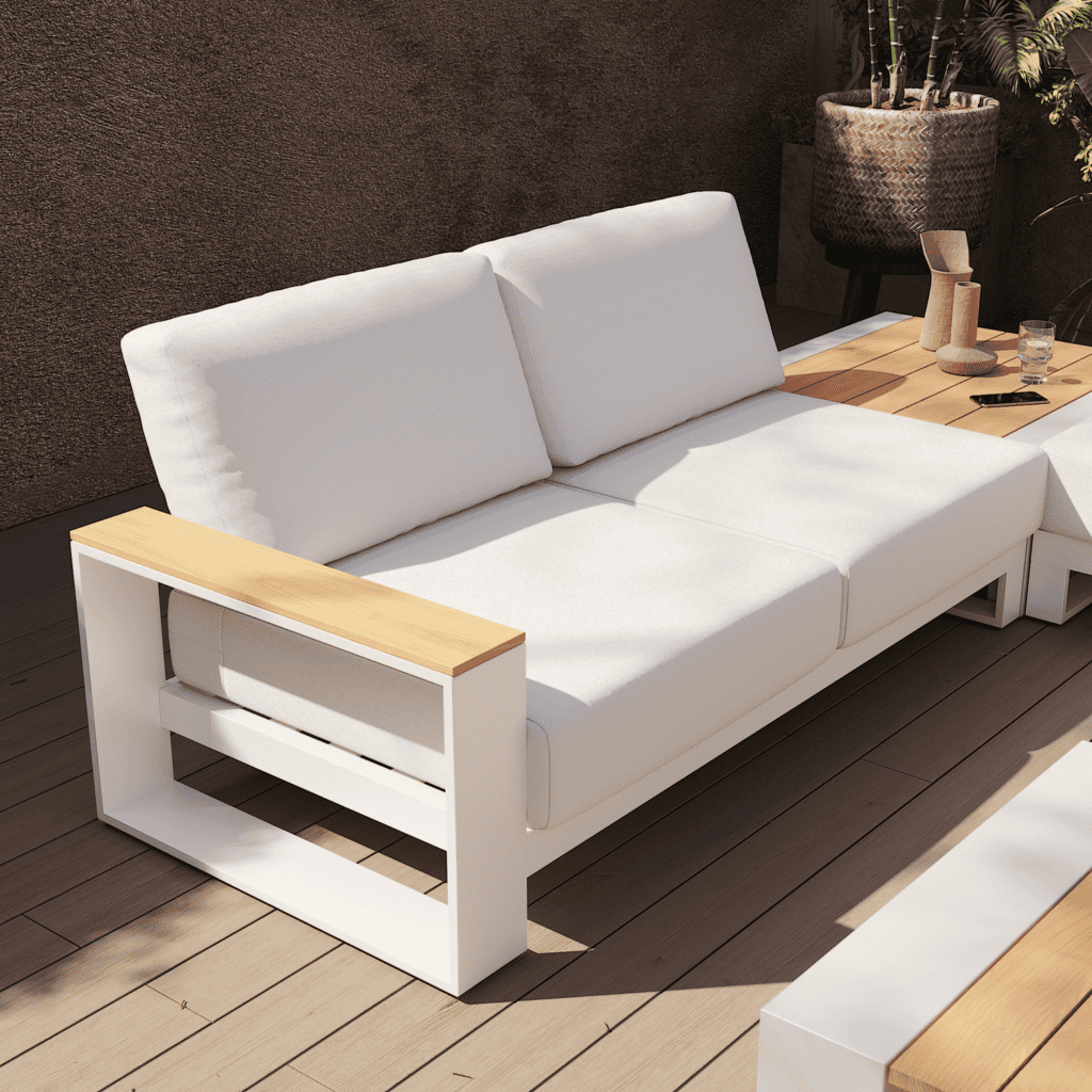 Le canapé d’extérieur Rafi est conçu pour durer. Sa structure en aluminium résiste aux intempéries et à la corrosion, et ses coussins sont déhoussables et lavables en machine, facilitant l’entretien au quotidien. Le teck est un bois robuste, reconnu pour sa résistance à l’eau et aux moisissures. Il est certifié FSC, garantissant une gestion durable des forêts. Pour prolonger la durée de vie du mobilier, une application annuelle d’huile de teck ou de saturateur permet de nourrir et de protéger le bois. L’usage d’une housse protège le mobilier et préserve sa couleur. Un léger ponçage suffit à raviver la teinte d’origine après quelques saisons.