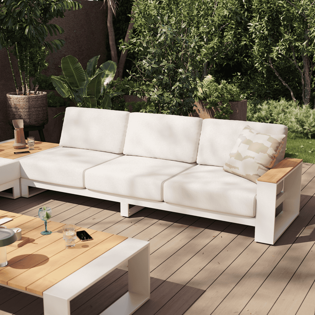 Le canapé d’extérieur Rafi est conçu pour durer. Sa structure en aluminium résiste aux intempéries et à la corrosion, et ses coussins sont déhoussables et lavables en machine, facilitant l’entretien au quotidien. Le teck est un bois robuste, reconnu pour sa résistance à l’eau et aux moisissures. Il est certifié FSC, garantissant une gestion durable des forêts. Pour prolonger la durée de vie du mobilier, une application annuelle d’huile de teck ou de saturateur permet de nourrir et de protéger le bois. L’usage d’une housse protège le mobilier et préserve sa couleur. Un léger ponçage suffit à raviver la teinte d’origine après quelques saisons.