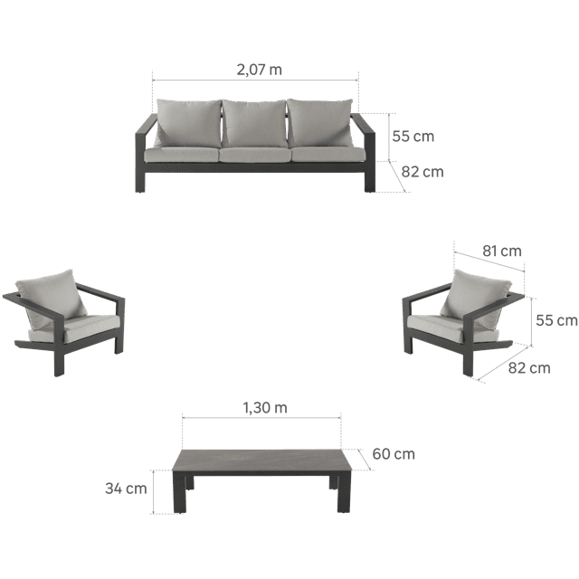 Ses lignes obliques, ses angles secs et ses coloris anthracite et gris moyen font de ce salon de jardin une œuvre unique qui viendra sublimer l’ambiance design de votre terrasse. Le choix de l’aluminium comme matériau principal associé à la pierre effet marbre du plateau viennent appuyer ce style design. Véritable pièce contemporaine, ce salon de jardin fera jalouser tous vos invités.Combinez-le avec l’espace repas Aquila et le rocking chair Lyco pour créer un ensemble design harmonieux sur votre terrasse.