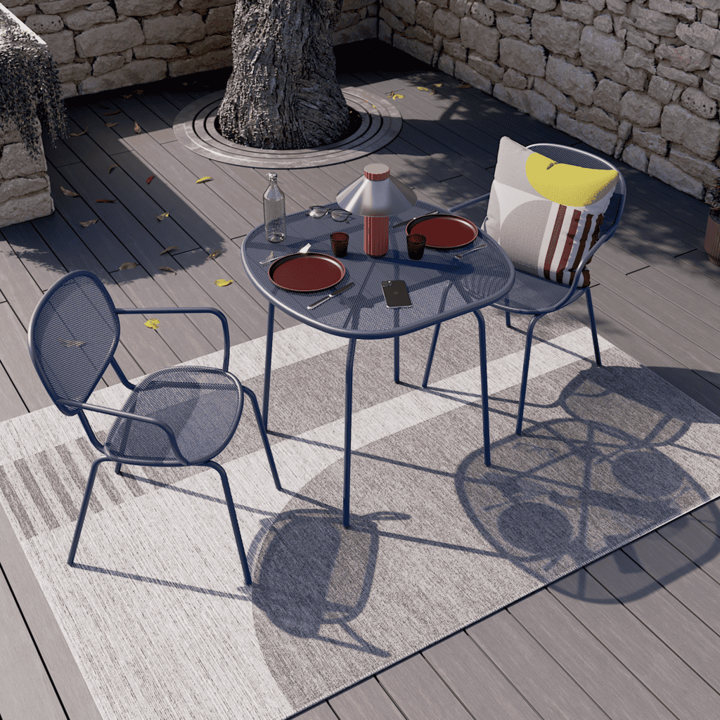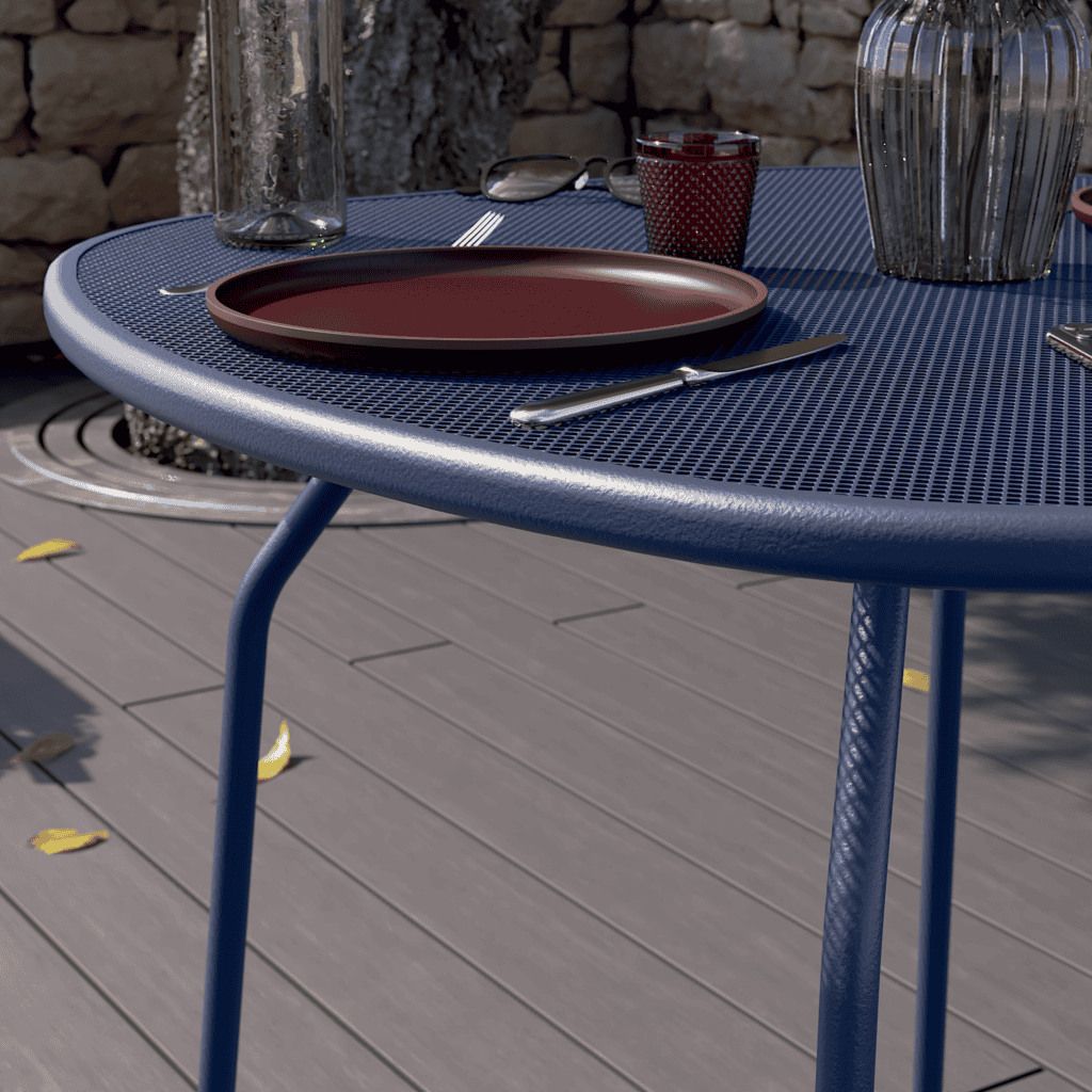 Avec son design épuré, sa forme ovale et sa couleur bleu, la gamme Ikaros apportera un style industriel tendance à votre extérieur. Ses finitions en acier perforé apporteront un style contemporain unique à votre terrasse. Coordonnez-la avec les chaises de la gamme pour créer un espace repas design à l’extérieur.