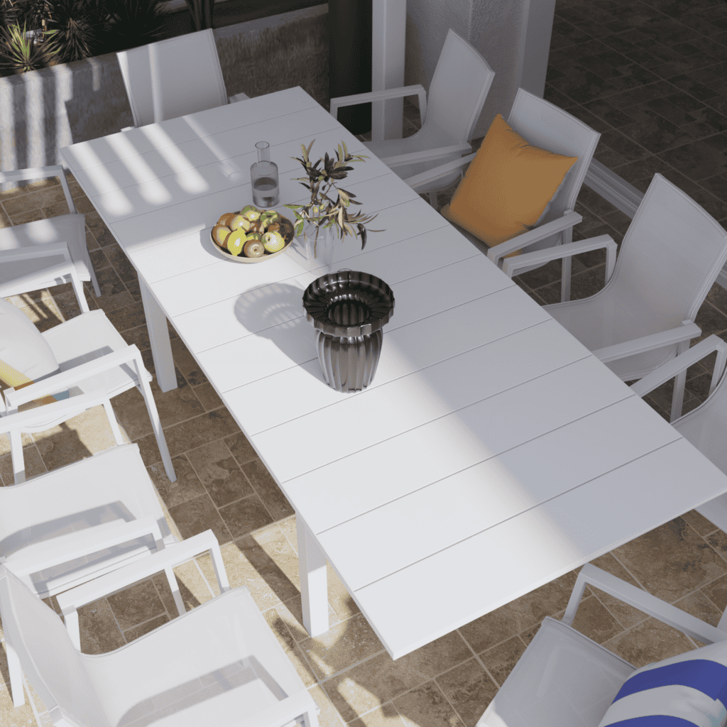 Facile à entretenir, un simple coup d’éponge humide suffit à nettoyer votre table de jardin. Sa structure est fabriquée en aluminium, dont 50% d’aluminium recyclé, rendant l’ensemble résistant à la rouille et aux intempéries. En hiver, pensez à couvrir votre ensemble de jardin d’une housse Naterial pour le protéger des salissures et de l’humidité.