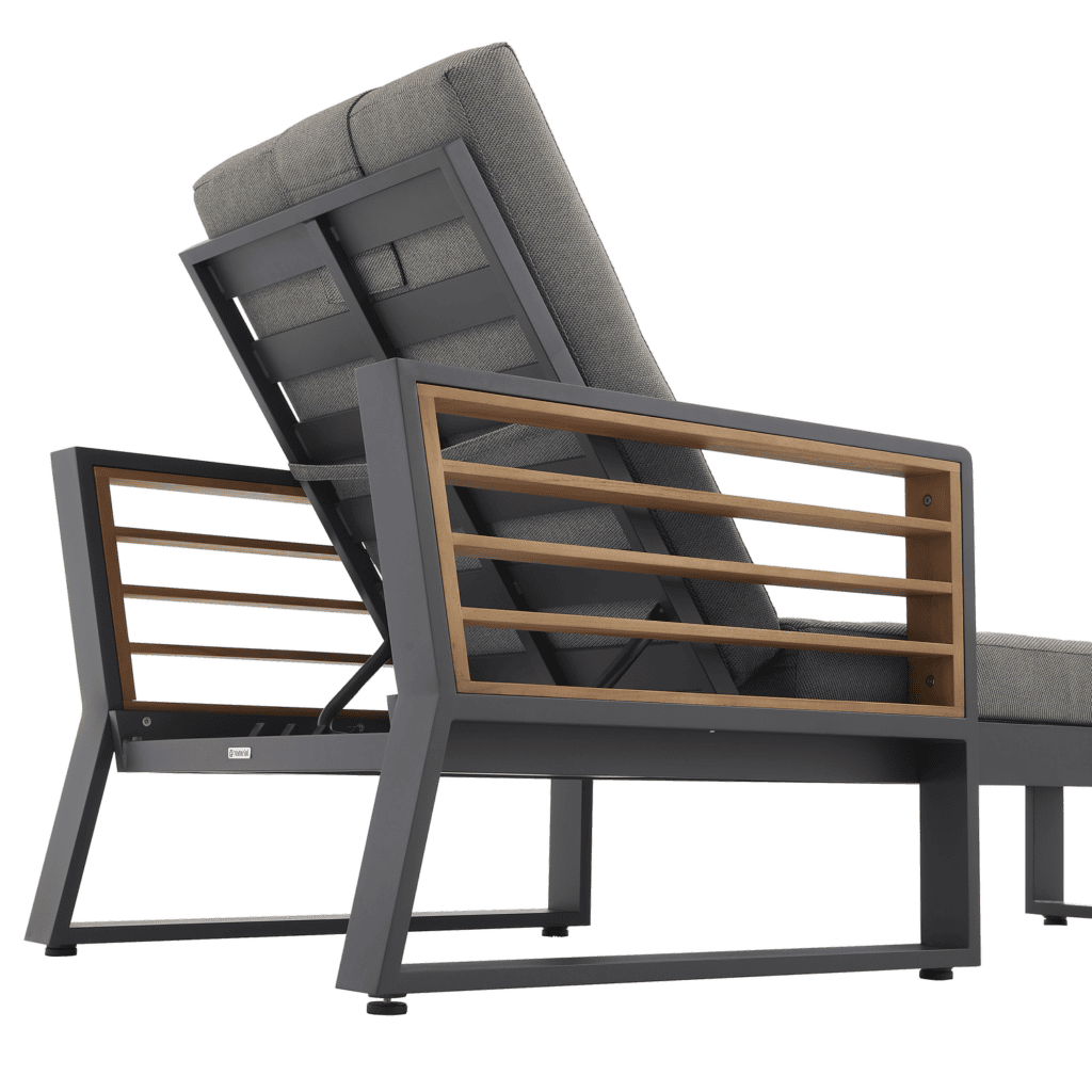 L’association du métal peint en gris anthracite mat et du teck des accoudoirs du transat Ionis apporte une ambiance industrielle digne d’un loft sur votre terrasse. Ce bain de soleil se combine parfaitement avec le salon de jardin de la série Ionis qui reprennent les mêmes lignes et matières.