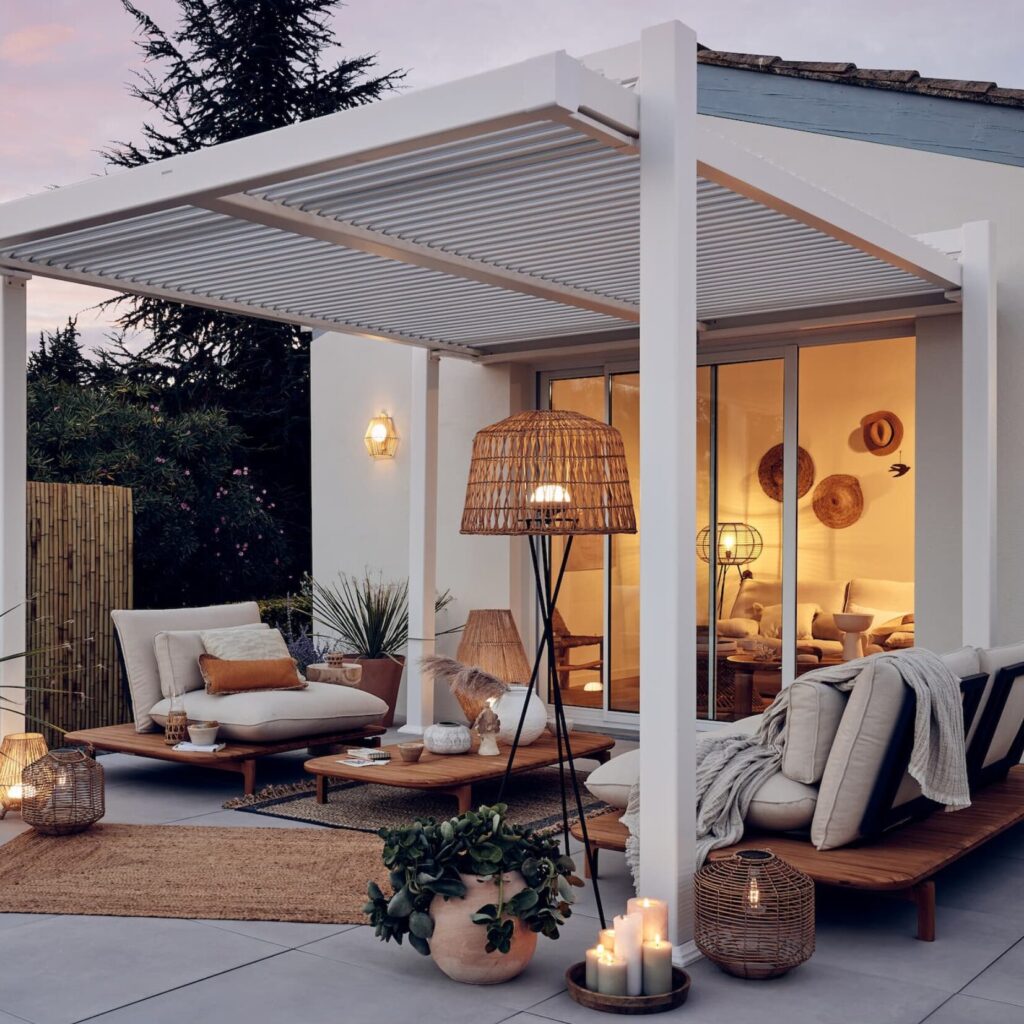 Quando a luz diminui, a pérgola transforma-se num verdadeiro refúgio. Algumas fontes de luz bem escolhidas, uma manta, música suave… e o seu terraço ganha uma nova atmosfera. Para prolongar as noites, aposte em acessórios têxteis, numa mesa de centro convidativa, ou até num braseiro ou aquecedor portátil, dependendo da estação. O ideal é ter planeado o seu espaço de forma a manter o conforto mesmo depois do anoitecer.