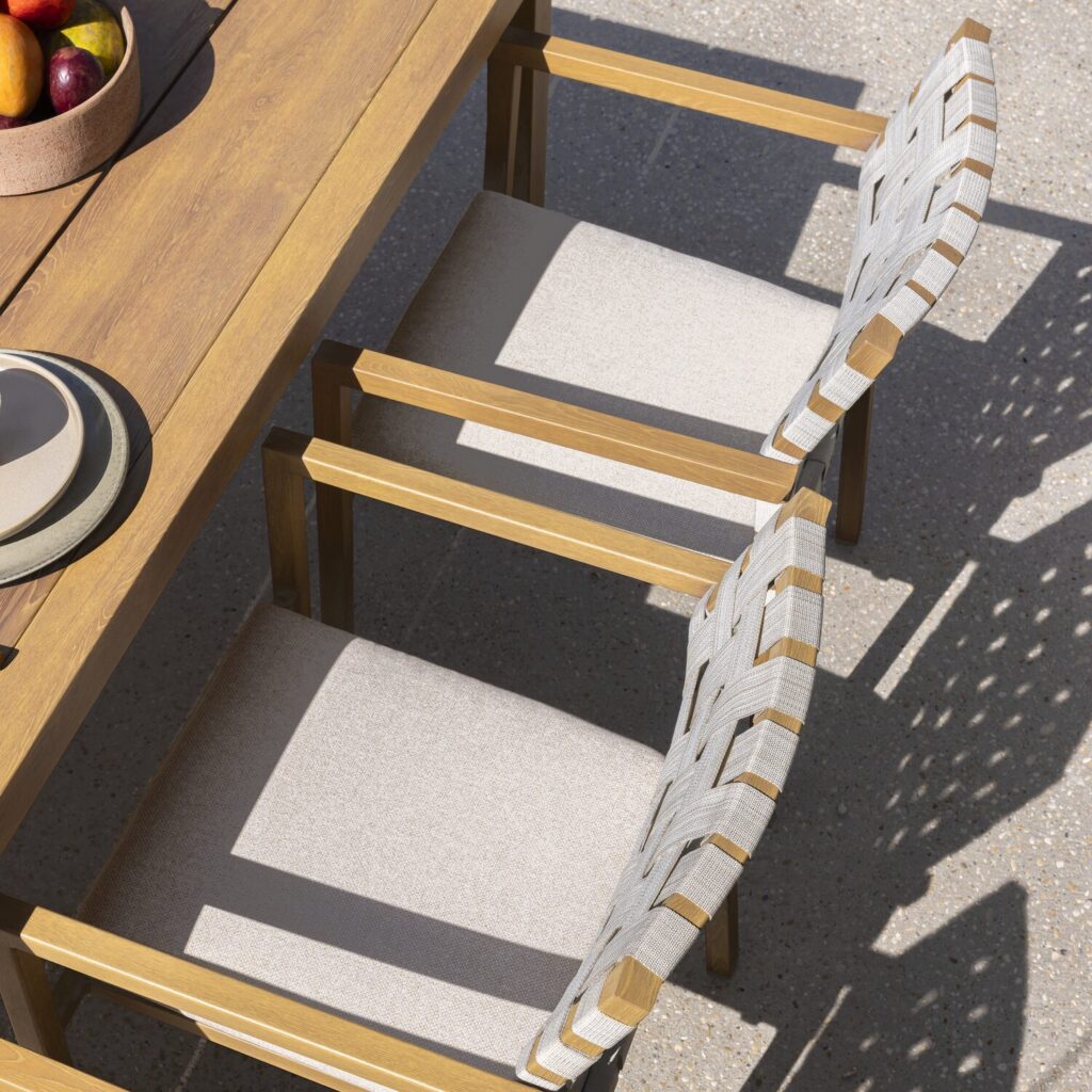 Fácil de manter, a cadeira Okinawa pode ser limpa simplesmente com um pano úmido. Sua estrutura de alumínio é resistente à ferrugem e aos raios UV, garantindo uma longa vida útil. A capa removível da almofada, repelente à água, pode ser lavada na máquina para facilitar a limpeza. No inverno, lembre-se de proteger o conjunto com uma capa protetora e guardar as almofadas longe da umidade.