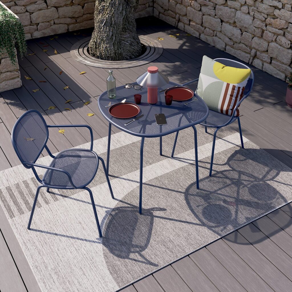 Fácil de manter, basta um pano úmido para limpar sua mesa de jardim. Sua estrutura de aço com tratamento eletroforético é resistente à ferrugem e aos raios UV, garantindo longa vida útil. No inverno, considere cobrir seus móveis de jardim com uma capa protetora para protegê-los da sujeira e da umidade. Caso surja qualquer sinal de corrosão no aço, aplique imediatamente um inibidor de ferrugem para evitar que ela se espalhe.