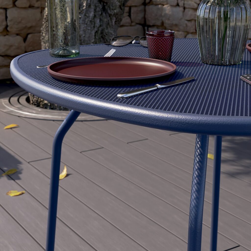 Com seu design clean, formato oval e cor azul, a linha Ikaros trará um estilo industrial moderno para o seu espaço externo. Seu acabamento em aço perfurado adicionará um toque contemporâneo único ao seu pátio. Combine-a com as cadeiras da mesma linha para criar uma área de jantar externa elegante.