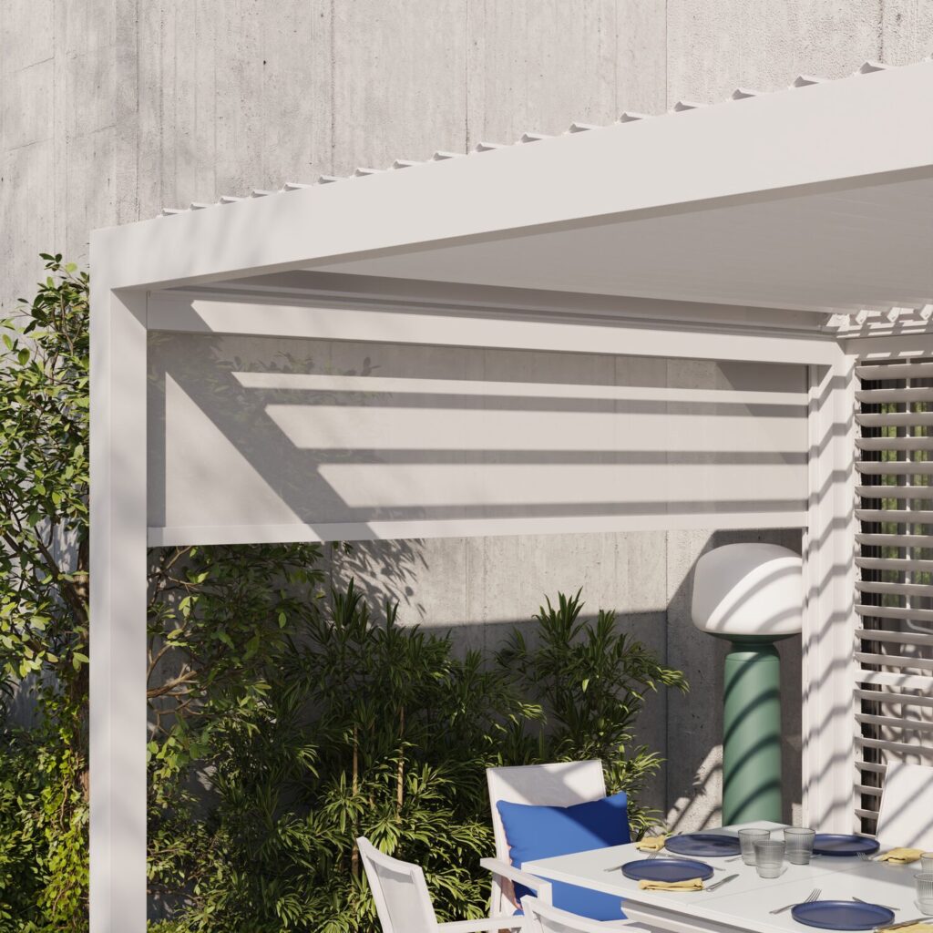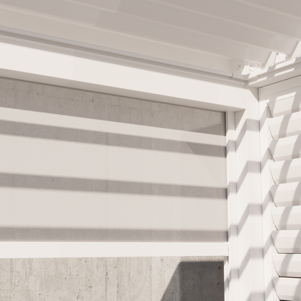 Projetado para ser acoplado à pérgola bioclimática Astra, o toldo de textilene Astra de 3 m permite que você desfrute de refeições em família com total privacidade. Seu tecido de textilene proporciona proteção visual e sombra eficaz, criando um espaço íntimo para refeições, protegido da vista de todos. Ele se ajusta a qualquer altura para se adaptar às suas necessidades e à posição do sol. Modular, pode ser acoplado a todas as pérgolas Clima Astra (lado de 3 m).