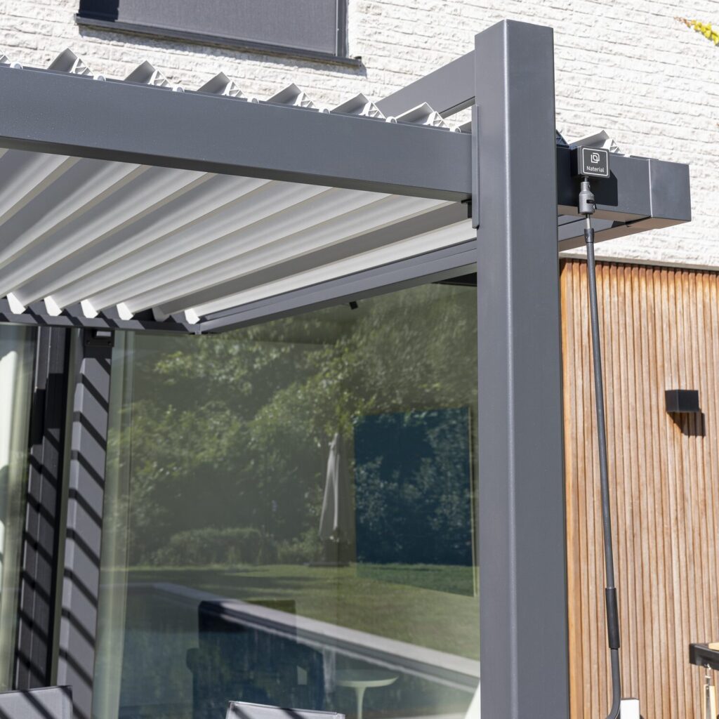 Viva em completa harmonia com o ambiente ao seu redor sob a pérgola bioclimática Clima Odyssea. Graças às suas lâminas ajustáveis (0 a 90°), você tem controle perfeito sobre a luz e a ventilação natural sob esta pérgola adaptável. No verão, ajuste as lâminas usando a manivela para criar sombra: a cor clara das lâminas foi especialmente escolhida para refletir a luz solar e evitar o acúmulo de calor. Quando inclinadas, elas criam uma brisa suave e refrescante, permitindo que o ar quente escape. No inverno, abra as lâminas para deixar a luz entrar e aquecer o seu interior. Quando fechadas, as lâminas direcionam a água da chuva para um sistema de drenagem integrado às pernas da estrutura.
