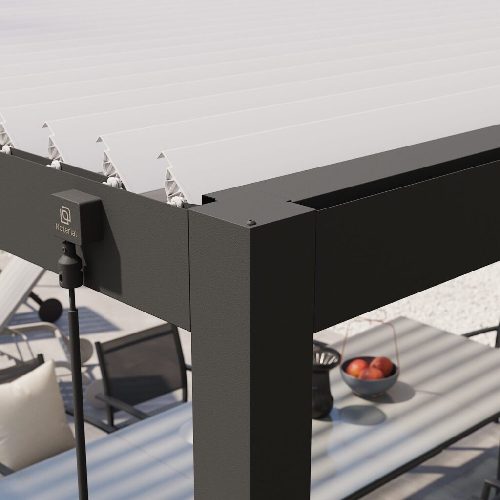Viva em completa harmonia com o ambiente ao seu redor sob a pérgola bioclimática quadrada Clima Astra. Graças às suas lâminas ajustáveis (0 a 120°), você pode controlar perfeitamente a luz ao longo do dia e a ventilação natural sob esta pérgola adaptável de 3,6 m x 3,6 m. No verão, ajuste as lâminas usando a manivela para criar sombra: a cor clara das lâminas foi especialmente escolhida para refletir a luz solar e evitar o acúmulo de calor. Quando inclinadas, elas criam uma brisa suave e refrescante, permitindo que o ar quente escape. No inverno, abra as lâminas para deixar a luz entrar e aquecer o seu interior. Quando fechadas, as lâminas direcionam a água da chuva para um sistema de drenagem integrado às pernas da estrutura.