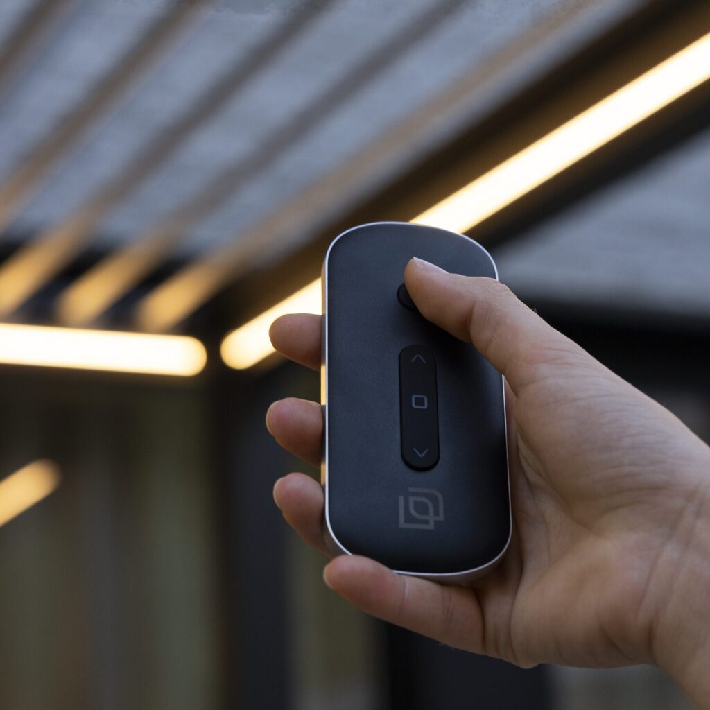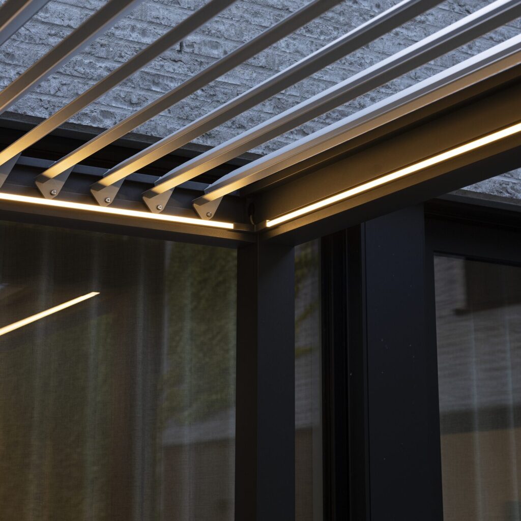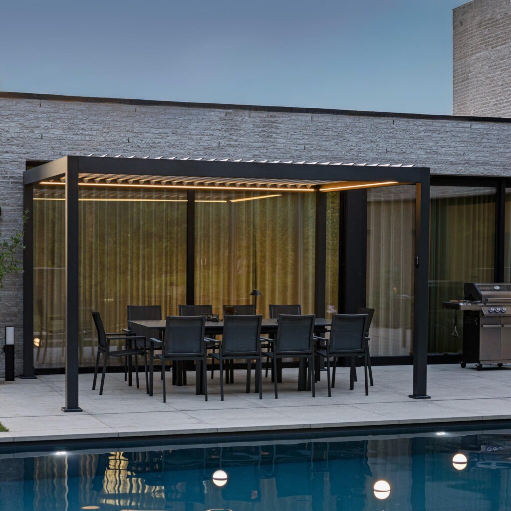 Viva em completa harmonia com o ambiente ao seu redor sob a pérgola bioclimática motorizada Clima Astra. Graças às suas lâminas ajustáveis ​​(0 a 120°), você tem controle perfeito sobre a luz ao longo do dia e ventilação natural sob esta pérgola adaptável de 3m x 4m. Seu controle remoto permite abrir e fechar as lâminas sem esforço, como desejar. No verão, ajuste as lâminas para criar sombra: a cor clara das lâminas foi especialmente escolhida para refletir a luz solar e evitar o acúmulo de calor. Quando inclinadas, elas criam uma brisa suave e refrescante, permitindo que o ar quente escape. No inverno, abra as lâminas para deixar a luz entrar e aquecer o interior. Ao final do dia, crie uma atmosfera aconchegante sob a pérgola ligando as fitas de LED integradas, ajustáveis ​​em três níveis de brilho por meio do controle remoto, para prolongar sua noite ao ar livre. Quando fechadas, as lâminas direcionam a água da chuva para um sistema de drenagem integrado às pernas da estrutura.