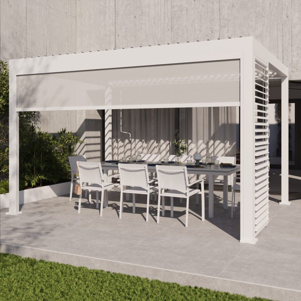 Viva em completa harmonia com o ambiente ao seu redor sob a pérgola bioclimática motorizada Clima Astra. Graças às suas lâminas ajustáveis (0 a 120°), você tem controle perfeito sobre a luz ao longo do dia e ventilação natural sob esta pérgola adaptável de 3m x 4m. Seu controle remoto permite abrir e fechar as lâminas sem esforço, como desejar. No verão, ajuste as lâminas para criar sombra: a cor clara das lâminas foi especialmente escolhida para refletir a luz solar e evitar o acúmulo de calor. Quando inclinadas, elas criam uma brisa suave e refrescante, permitindo que o ar quente escape. No inverno, abra as lâminas para deixar a luz entrar e aquecer o interior. Ao final do dia, crie uma atmosfera aconchegante sob a pérgola ligando as fitas de LED integradas, ajustáveis em três níveis de brilho por meio do controle remoto, para prolongar sua noite ao ar livre. Quando fechadas, as lâminas direcionam a água da chuva para um sistema de drenagem integrado às pernas da estrutura.