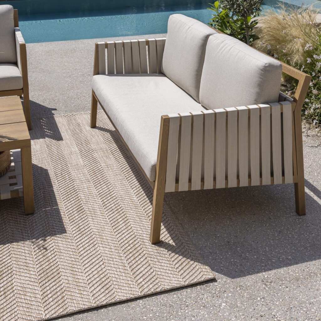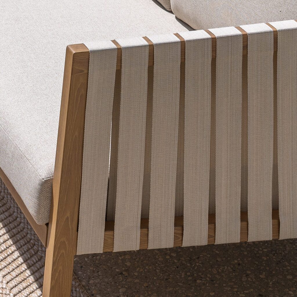 O sofá de exterior Okinawa foi projetado para durar. Sua estrutura de alumínio é resistente às intempéries e à corrosão, garantindo longa vida útil. Suas almofadas removíveis e repelentes à água podem ser lavadas na máquina para facilitar a limpeza. No inverno, considere proteger o conjunto com uma capa Natural e mantenha as almofadas longe da umidade.
