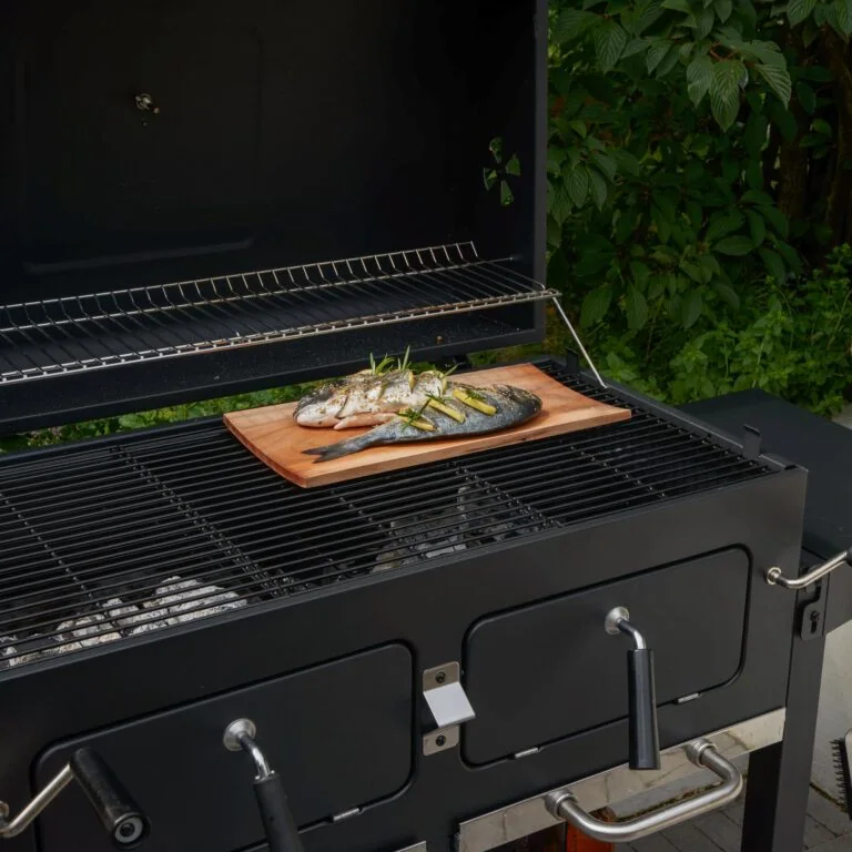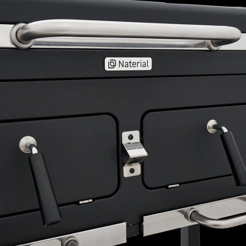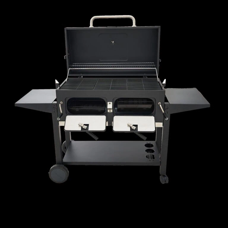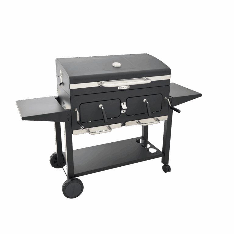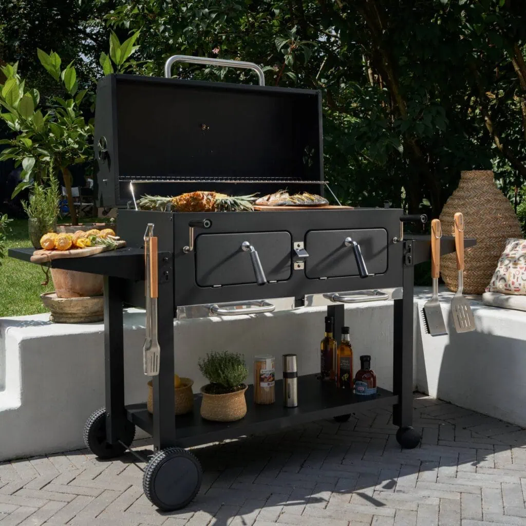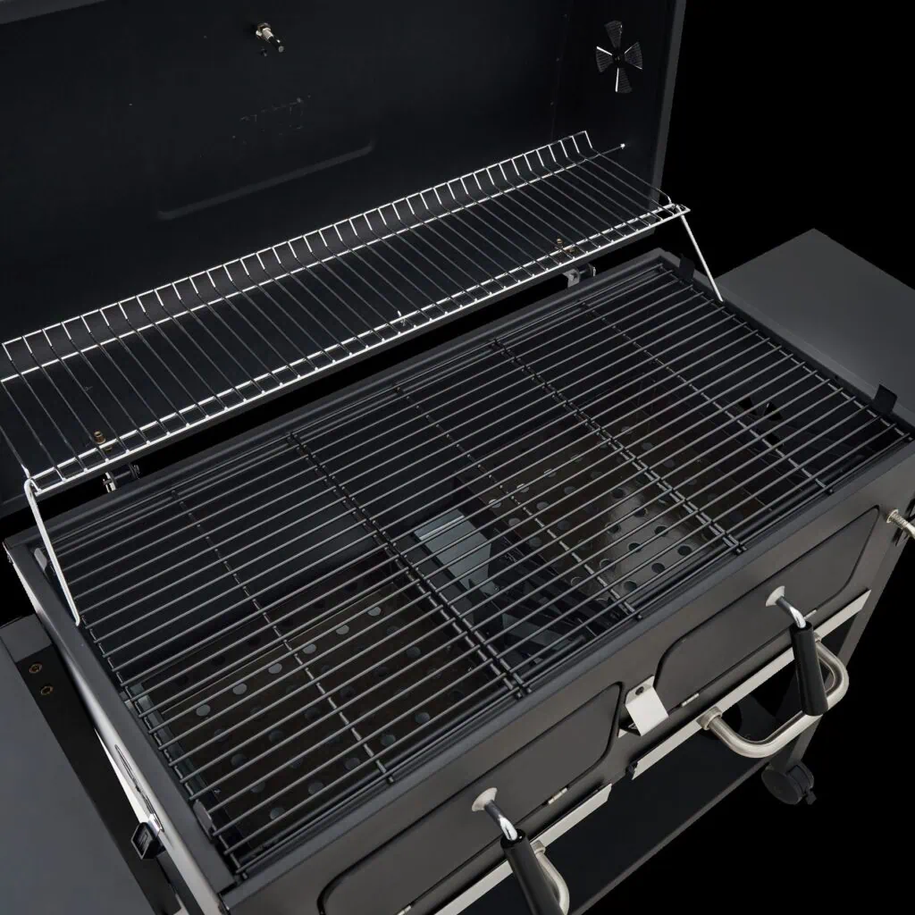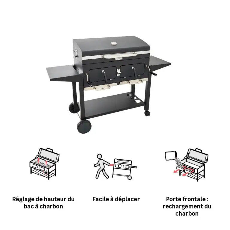 Esta barbacoa está diseñada para la comodidad del usuario: una rejilla de calentamiento plegable evita que la comida se caiga y las mesas laterales plegables ofrecen un espacio de preparación optimizado. Los dos soportes para carbón, ajustables en altura, permiten un control preciso del calor. Dos puertas independientes facilitan la adición de carbón sin interrumpir la cocción. Además de su funcionalidad, la barbacoa incluye detalles prácticos como un abridor de botellas, asas para mover las rejillas y recogedores de cenizas que también pueden usarse para recoger la grasa.