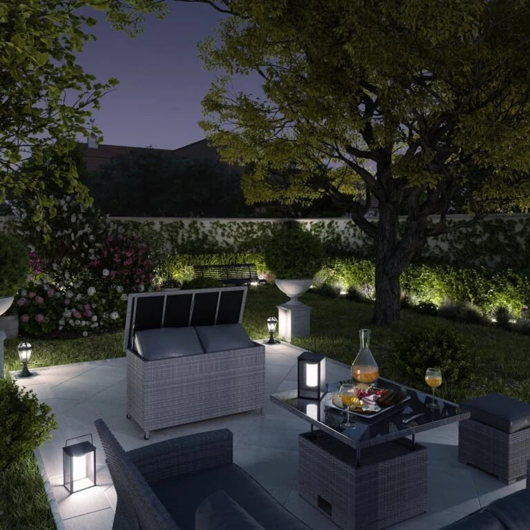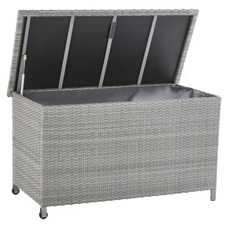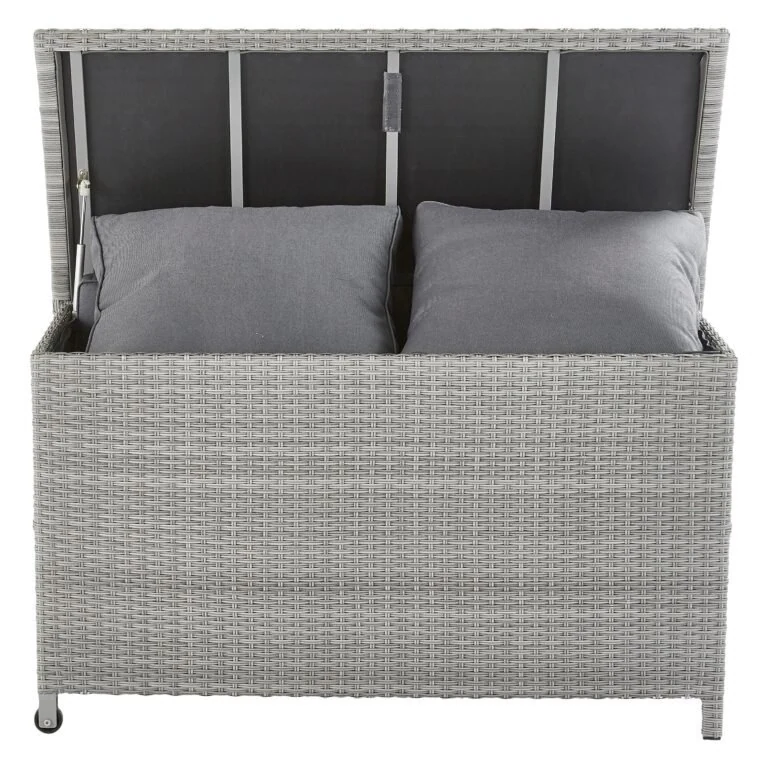 La caja de jardín Davos ofrece 420 litros de espacio de almacenamiento. No más cojines tirados y expuestos a la lluvia.