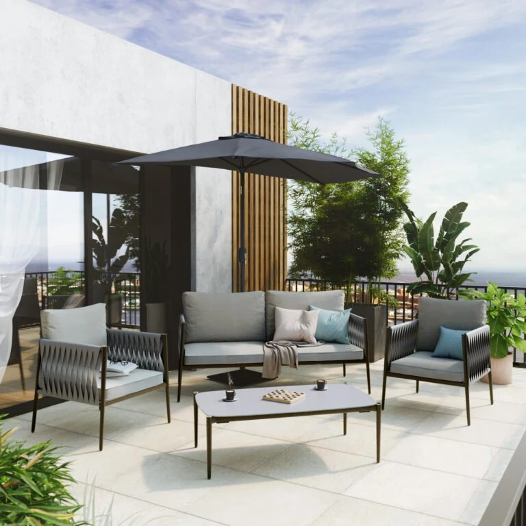Para conservar tus muebles, se recomienda guardarlos en invierno bajo una funda transpirable Naterial durante largos periodos sin uso. Del mismo modo, los almohadones son totalmente desenfundables y deben protegerse de la humedad cuando no se utilicen. Tanto el aluminio como la encimera de cristal son fáciles de limpiar con un paño húmedo y un producto neutro.