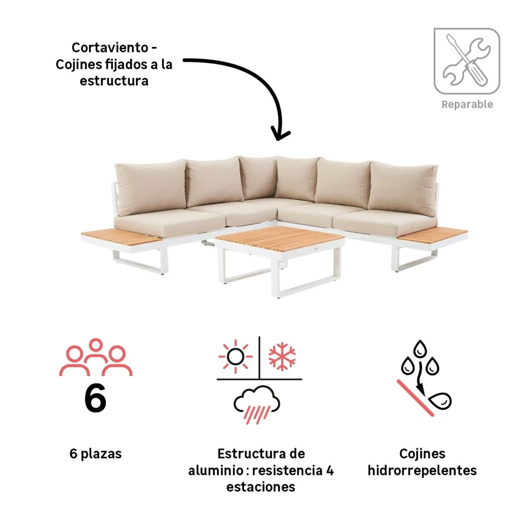 Disfruta de un café en la terraza en el salón esquinero Persea. Diseñado para un máximo de cinco personas, este conjunto se compone de un gran sofá esquinero y de una mesa auxiliar cuadrada. Su estructura de aluminio blanco se completa con bandejas laterales de teca, para tener todo al alcance. Los cojines de poliéster beige proporcionan un confort óptimo. De fácil mantenimiento, son hidrófugos y desfundables, y se pueden fijar a la estructura para evitar que vuelen cuando haya viento.