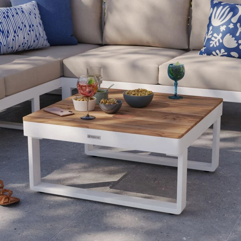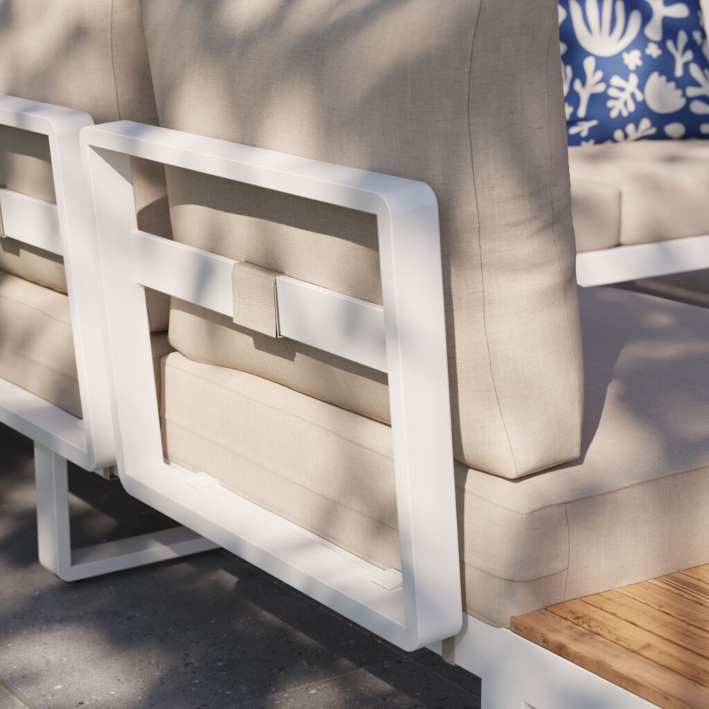 Fabricada en aluminio resistente a la intemperie y en teca certificada FSC, toda la gama Persea aportará un toque moderno bimaterial a tu terraza. Disponible en blanco y antracita, este conjunto esquinero se puede completar con un sillón individual para acomodar a una persona más, así como con una mesa auxiliar lateral adicional. Se combina perfectamente con las mesas y sillas de jardín Persea, creando un espacio exterior elegante y funcional.