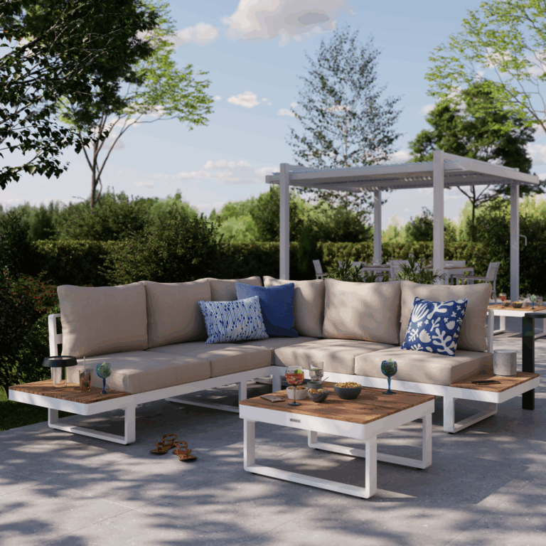 Disfruta de cada momento con el salón esquinero Persea, muebles funcionales y elegantes que transforman tu terraza en una verdadera zona de descanso.
