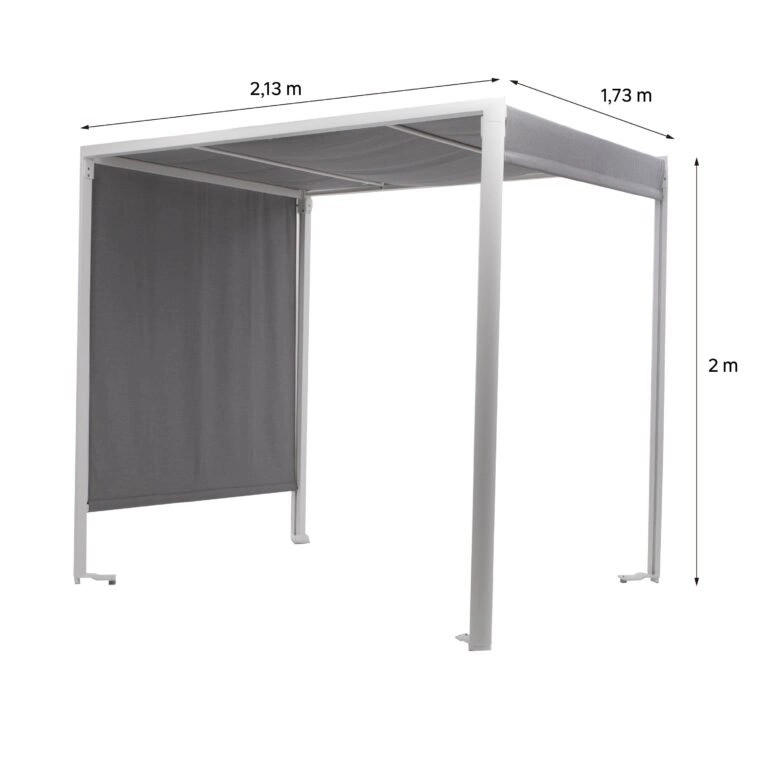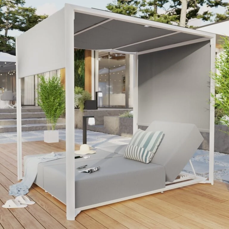 Fabricada en aluminio, la serie Neptuno, definida por su estructura blanca y sus telas grises, aporta a su exterior un efecto de diseño y ventilación que invita a relajarse.