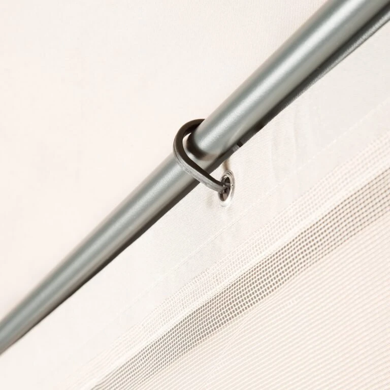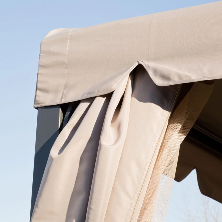 El gazebo Naterial Ysis protege a tus invitados del sol. Cubre una amplia superficie, que te permite instalar un juego de comedor debajo. Su toldo grueso y cuadrado mide 3×3 metros, es impermeable y bloquea el 90 % de los rayos UV. El gazebo cuenta con un mosquitero y cortinas que te permiten cerrarlo por completo y protegerte de los insectos. Su estructura de aluminio no se oxida y es resistente a las condiciones del clima. Para prolongar la vida útil del gazebo, el toldo puede reemplazarse.
