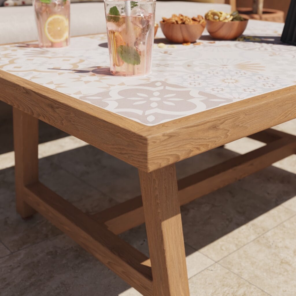 La originalidad de la gama Gaia reside en su superficie de cerámica estilo loza, que realzará su espacio exterior. Este mosaico, combinado con aluminio imitación madera, le dará un toque único a su terraza. Los asientos, tejidos con cuerda sintética que imita la cuerda natural, no solo son estéticos, sino que también garantizan durabilidad y resistencia al paso del tiempo. Combine este mobiliario de jardín con una de las mesas Gaia para crear un espacio único y bohemio en su terraza.