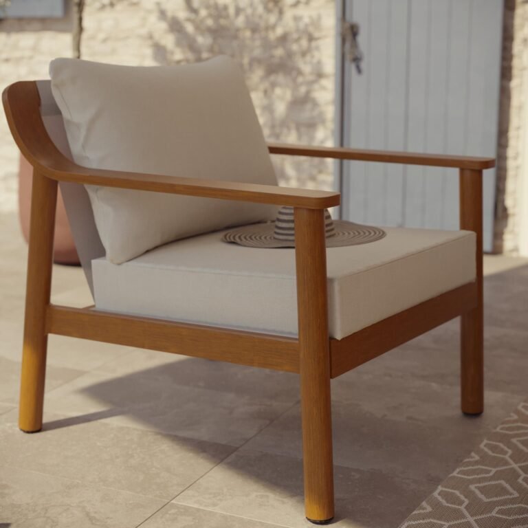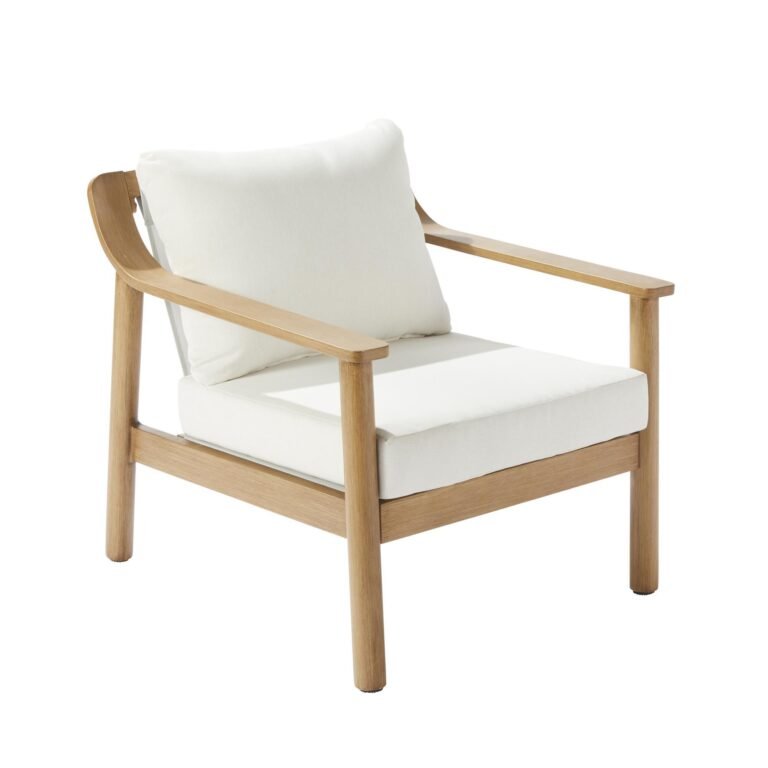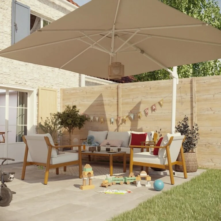 Sus formas redondeadas y su imitación de madera te permiten crear un espacio cálido y natural en tu terraza. Para darle más encanto a este conjunto, rodealo de plantas y flores, que naturalmente aromatizarán tu espacio. Para los días más soleados, refugiate bajo la sombrilla Aura White, ideal para mantener la armonía de tu exterior.