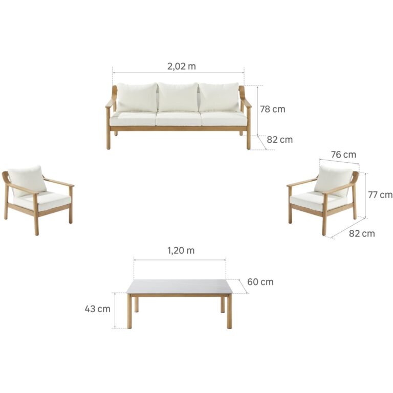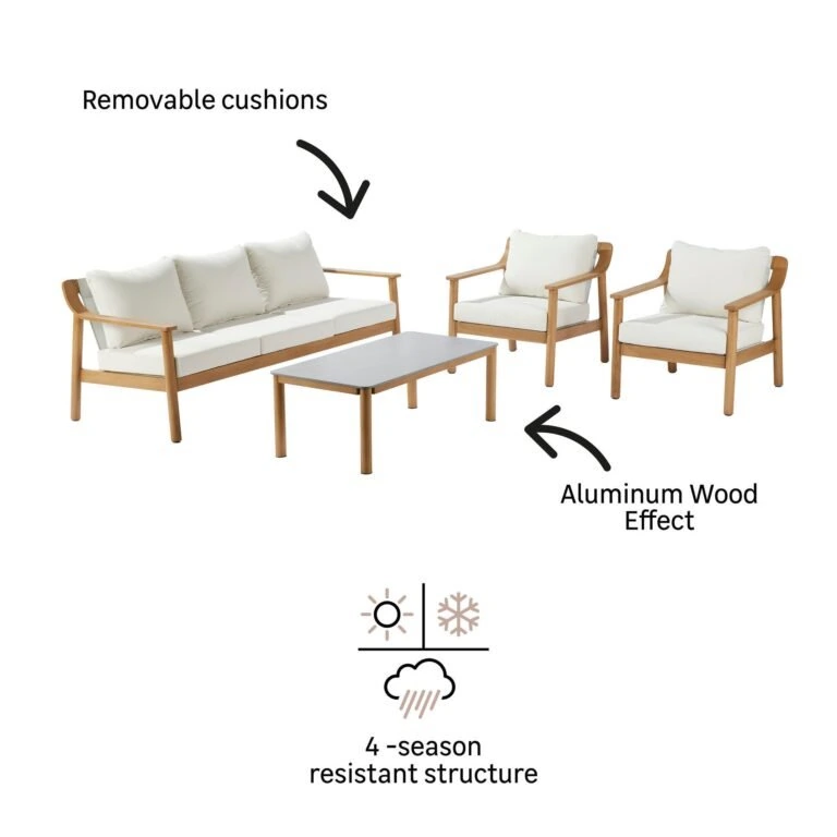 Disfrutá de las comidas familiares de los domingos con estilo y durabilidad gracias a nuestro juego de living de jardín Ares. Sus formas redondeadas y su estructura de aluminio imitación de madera te permiten crear un espacio cálido y natural en tu terraza.