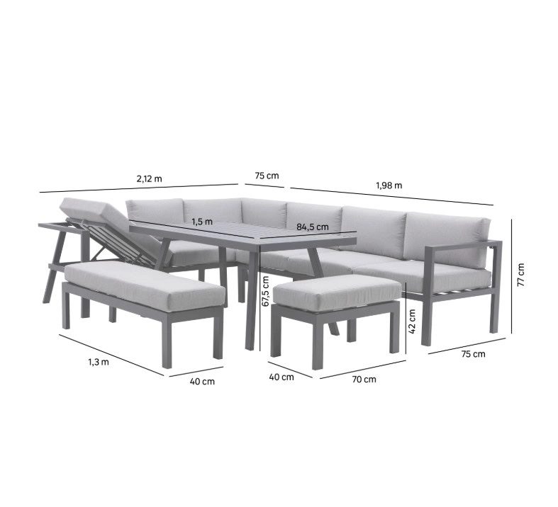Durante el día o la noche, disfrutá de momentos agradables en tu jardín con el juego esquinero Naxos. Está compuesto por un gran sofá esquinero, un taburete individual y un banco para 2 personas, que permite que tus invitados se sienten todos alrededor de la mesa. Ideal para compartir una comida, este set es una invitación a relajarse. Su sofá tiene un asiento reclinable que te permite acostarte, como en una reposera, sin aislarte. La mesa, así como la estructura del resto de los elementos, está fabricada en aluminio, lo que hace que tus muebles sean resistentes a la corrosión y la humedad. Todos los almohadones están hechos de poliéster, tratados con repelente al agua y protección UV para enlentecer su decoloración.