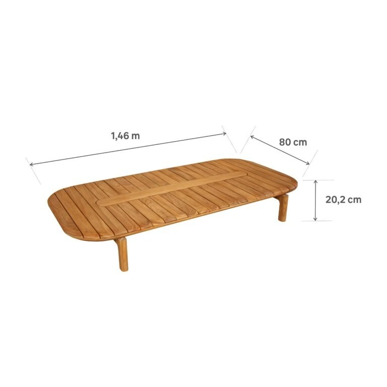 Disfruta de un momento de relajación alrededor de la mesa de café Aurora, el aliado ideal para tus noches de verano. Diseñada en teca, esta mesa es naturalmente resistente a la lluvia, al frío y no teme al moho. Perfectamente adaptada a la altura de los sofás, te permite tener tus bebidas, bocadillos y libros al alcance de la mano. Calificada para uso profesional, esta mesa también puede ser utilizada en una terraza de hotel o café.